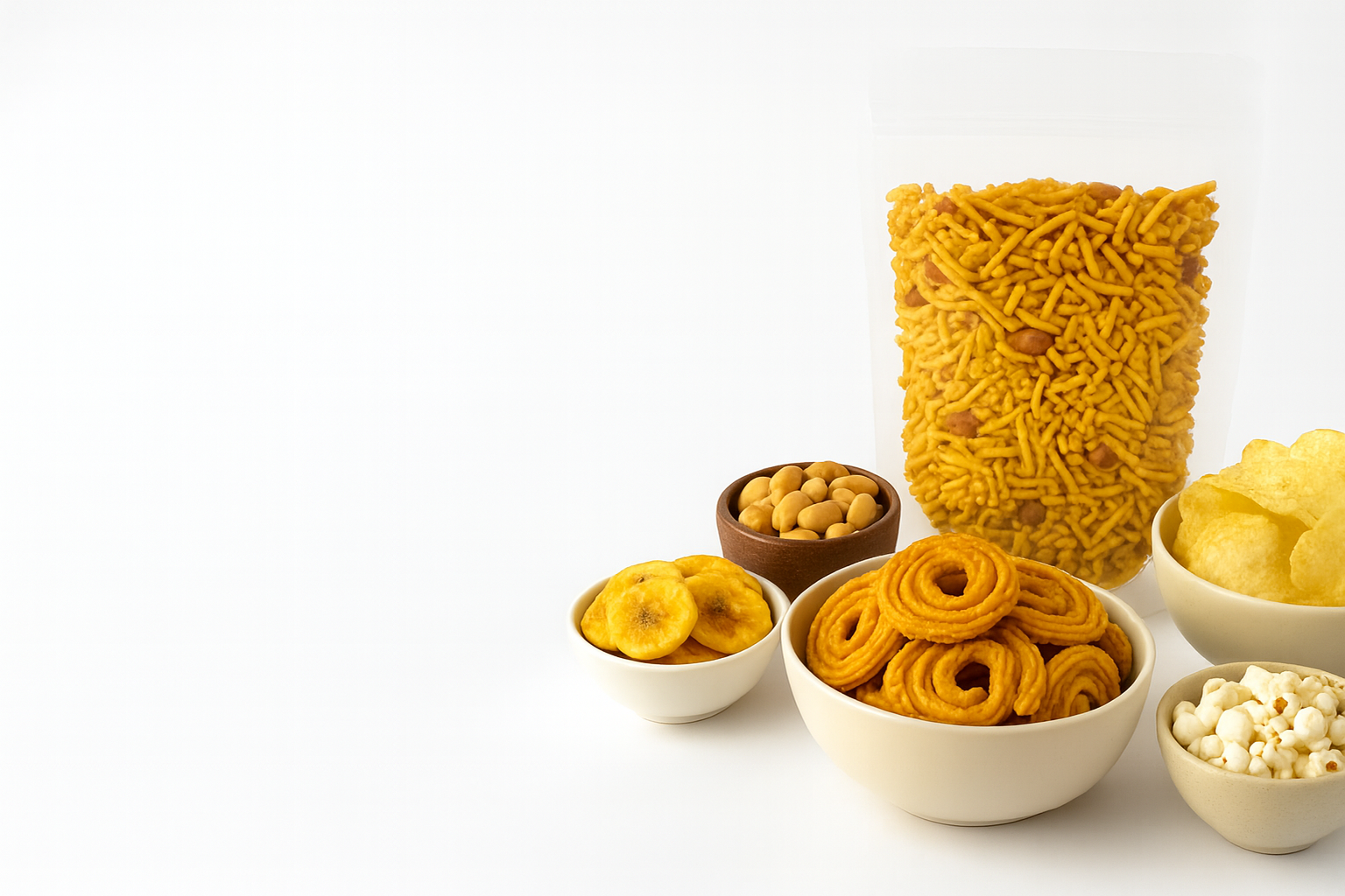 Discover our wide range of Indian snacks—mixtures, banana chips, murukku, peanuts, potato chips, popcorn, and more. We blend authentic recipes with modern packaging to deliver freshness and flavor in every bite. Perfect for tea-time, travel, celebrations, or just anytime cravings.